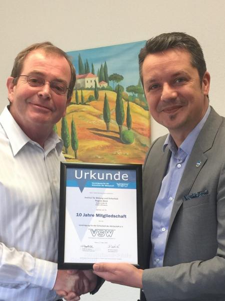 Anlässlich der 10-jährigen Mitgliedschaft übergab der Geschäftsführer der Vereinigung für die Sicherheit in der Wirtschaft e. V., Herr Gero Dietrich, persönlich die Urkunde an Inhaber Dittfried Jakubowski.